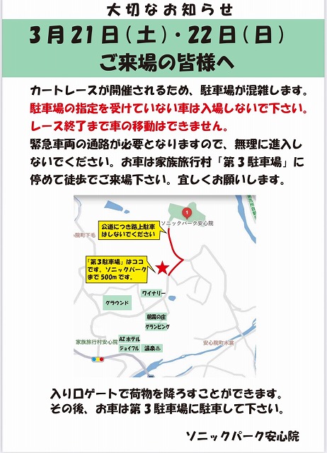 以外のお車の方や観戦の方々、できるだけ乗り合い等でお越し頂き、第3駐車場に